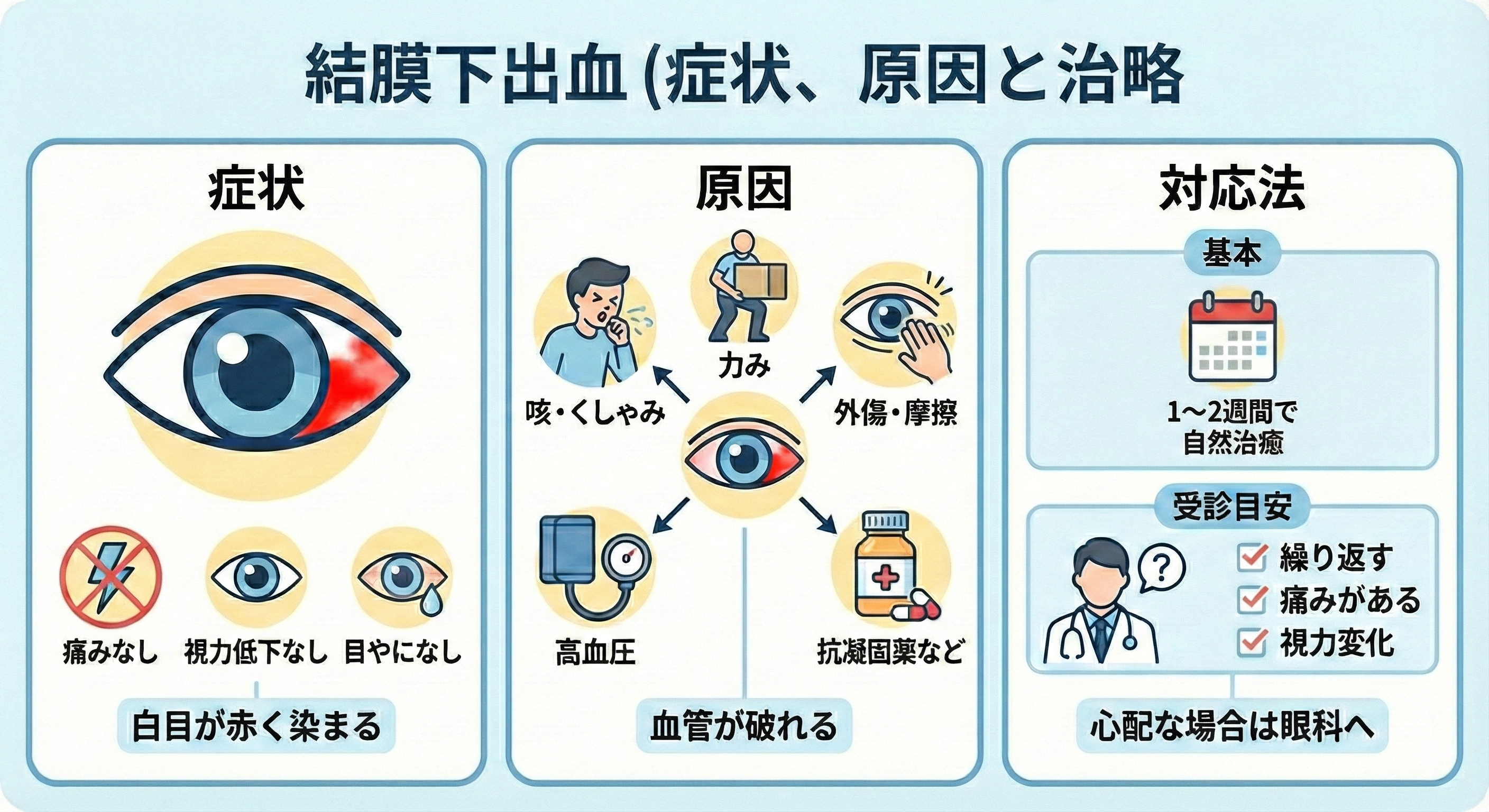 お薬について: 出血自体を止める特効薬はありませんが、ゴロゴロ感がある場合には炎症を抑える目薬や、血管を保護する目薬が処方されることもあります。